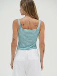 The Abby is a square neck tank in a soft stripe ribbed fabric. This tank hits top of pant depending on the rise.