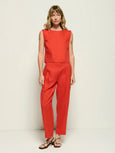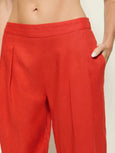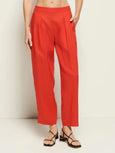 Mindful in form and fabric, the Grayson Pants are made of 100% linen and designed with versatility in mind. Featuring an elastic waistband, these tapered trousers include a gathered pleat detailing, front pockets, and baby slit at the hem for total ease. This one comes in Aurora Red.