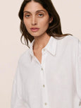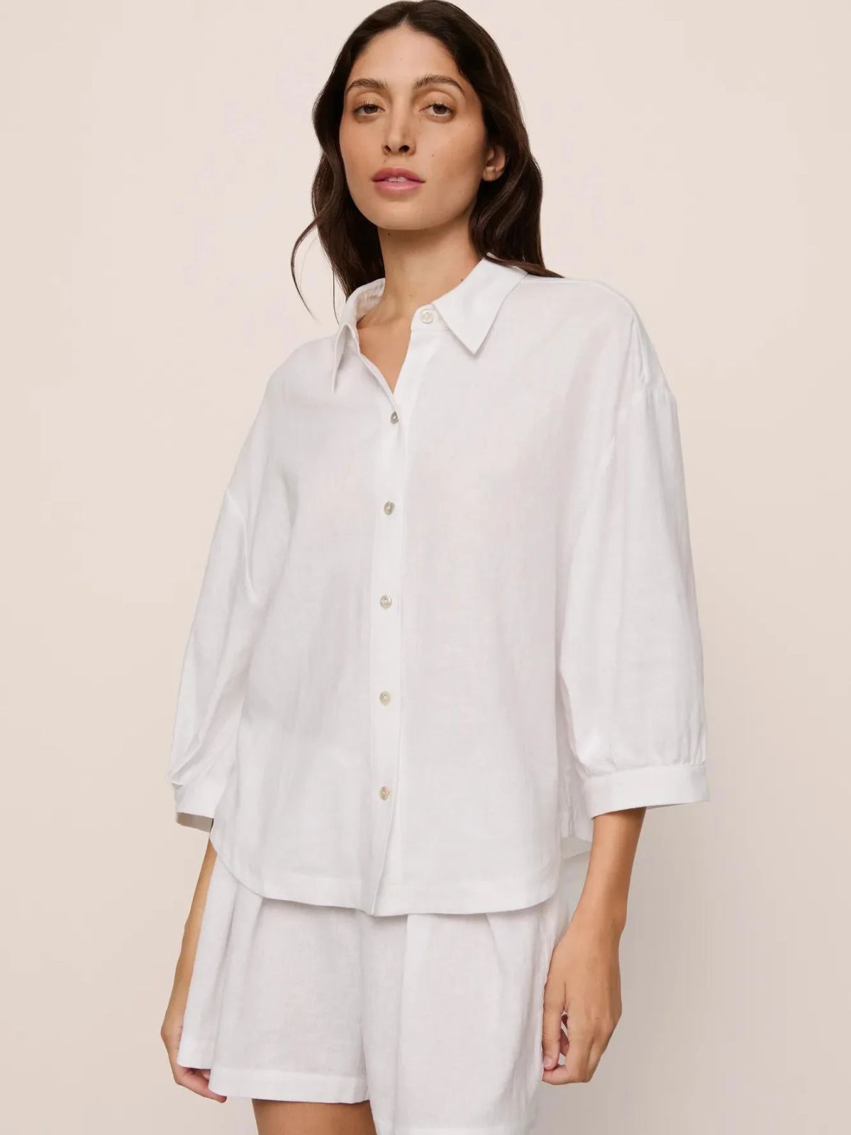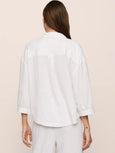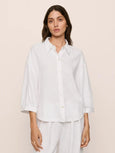 Easy breezy. Made from ECOVERO™ Viscose and linen, this fabric is verified by OEKO-TEX® Standard 100, meaning it was processed without harmful chemicals. This summer staple features a button-down 3/4 sleeve top with drop shoulders, blouson cuffs, a shirttail hem, and a back yoke with a box pleat.