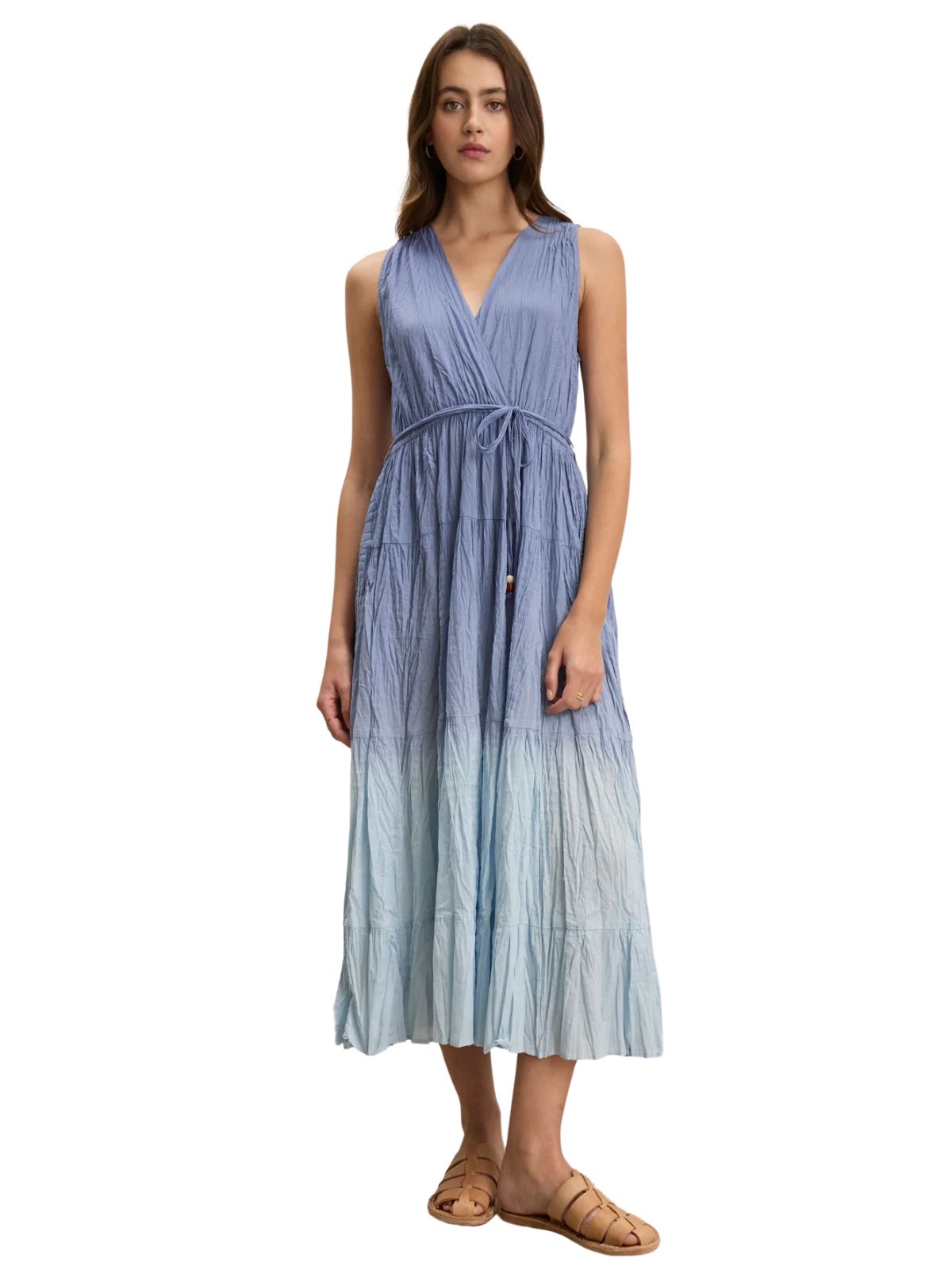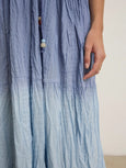 Designed with a wrap front V-neck and tiered silhouette, this dress offers a flattering, feminine fit. A detachable belt with beaded detailing adds a touch of elegance, while the unique dip-dye crinkle voile ensures each piece is one-of-a-kind. Finished with a thin horizontal strap detail on the back, it blends modern design with effortless style.