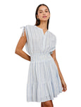 The Samina is a Grecian-style sundress crafted from soft luxe linen. The neckline opens at a half placket with natural shell buttons, while smocking cinches the waist and drawstrings at the straps allow for customizable styling.